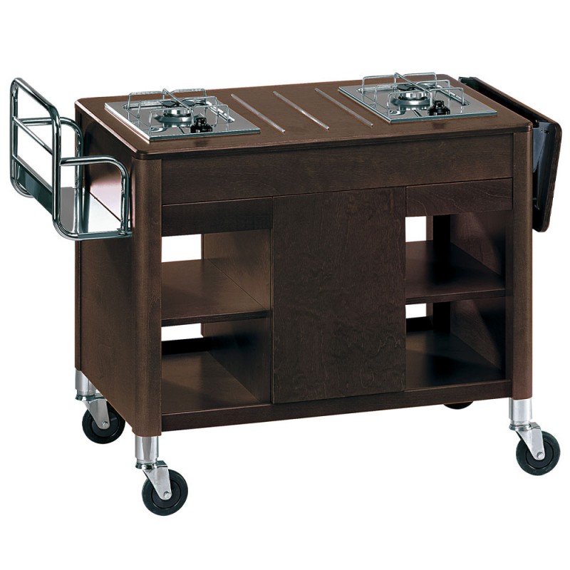 Structure en bois de hêtre massif. Finition wengé Tiroirs à couverts. Compartiments bonbonnes de gaz Brûleurs en acier inoxydable avec sûreté Support de bouteilles en acier finitions chromées Roulettes pivotantes, dont 2 avec freins NB: bonbonnes LPG et régulateur de pression non fournis