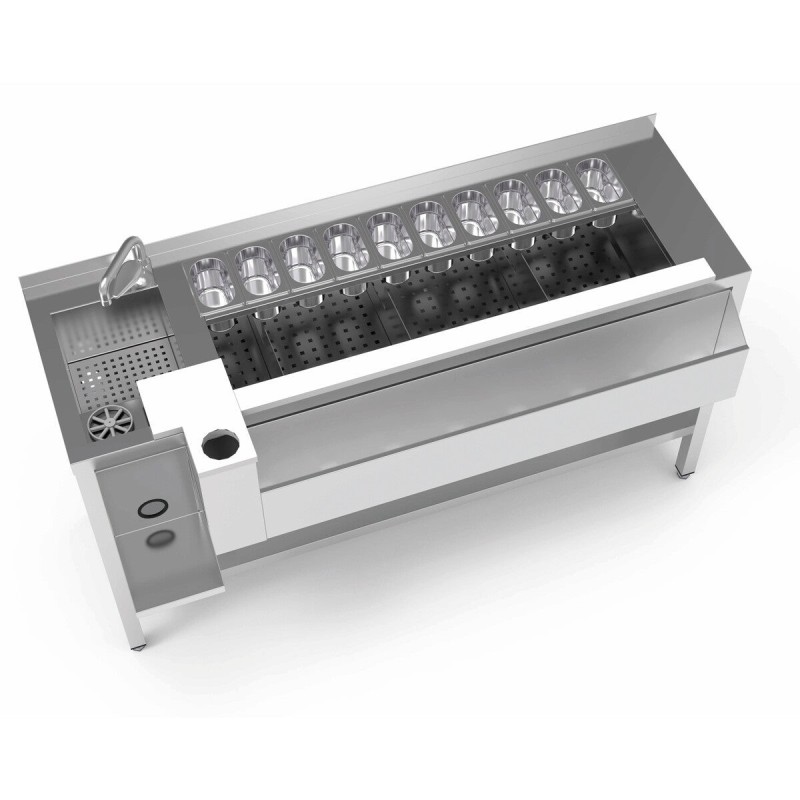 Capacité de la cuve isolée : 2 zones pour la glace, 1 zone pour les bouteilles et 1 zone pour les bacs 7 GN 1/9-100 (plateaux non inclus dans le prix, voir kit optionnel KC-160) -
