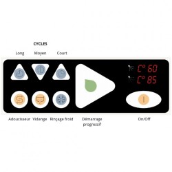 Ce modèle propose 4 cycles (1, 2, 4 ou 10 minutes) pour s’adapter à tous types de vaisselle. Il est également équipé d’un doseur automatique de produit de rinçage et d’une vidange par gravité.