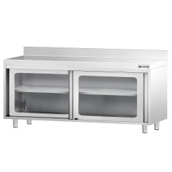 Cette armoire basse inox adossée avec portes coulissantes vitrées est un élément incontournable des restaurateurs.
