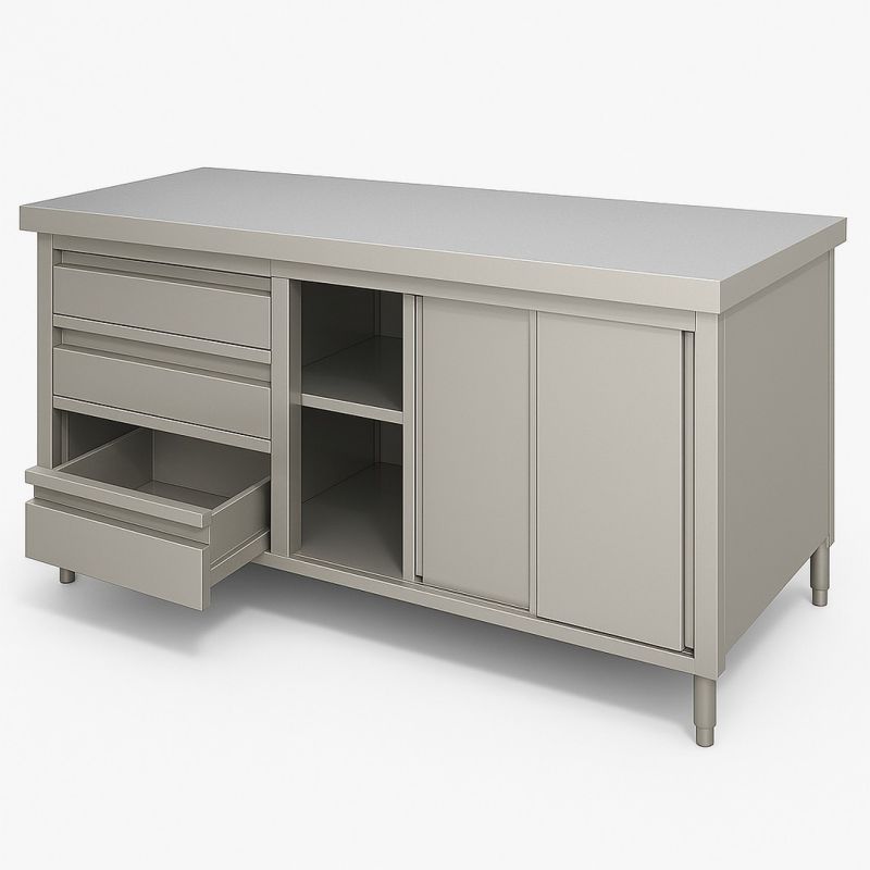 Meuble bas centrale sur placard 2 Niv. de rangement portes coulissantes et 3 tiroirs verticale à gauche Dim : 120 x 60 x 85 cm