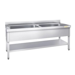 Plonge avec dosseret et une étagère inférieure sans égouttoir mais avec 2 bacs