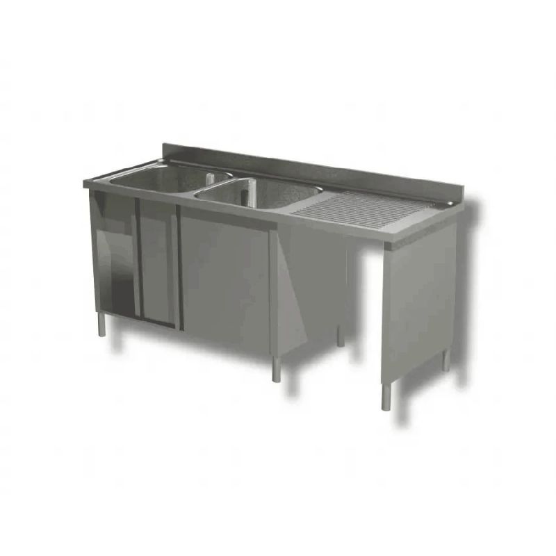 Plonge 2 bacs à gauche sur placard de rangement porte battante et passage lave vaisselle à droite Dim : 180 x 60 x 85 cm