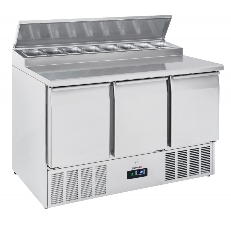 La Saladette 3 portes 8 x GN 1/6, référence CSA3P816, est un équipement en acier inoxydable doté d'un froid statique et d'un dégivrage automatique par cycle de compresseur. Elle utilise un agent moussant Cyclopentane de 45 mm par côté et est équipée d'un thermostat digital. Son encadrement est anti-condensation et les portes se verrouillent par clé, avec une fermeture automatique. Elle comprend 3 étagères réglables GN 1/1 et est adaptée pour 8 bacs GN 1/6 (non inclus). La température est réglable de +0°C à +8°C, avec une classe climatique 4. Sa capacité nette est de 376 L et sa capacité commerciale de 390 L. Elle utilise le fluide réfrigérant R 290, avec une puissance de 230 W / 230 V. Ses dimensions sont de L 1 365 x P 700 x H 1 005 mm et elle pèse 101 Kg.