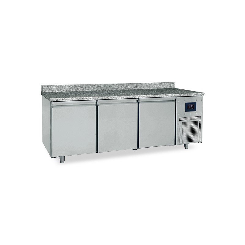 Desserte pâtissière réfrigérée adossée 3 portes 600/400 en inox AISI 304 avec plan de travail en granit
